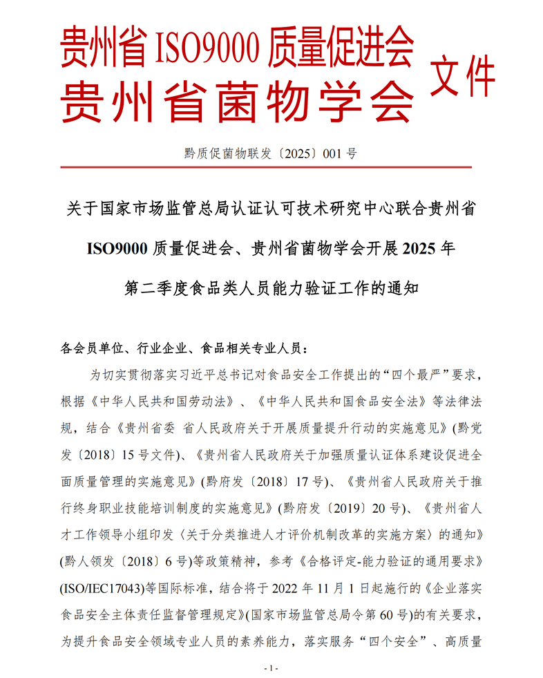 贵州省ISO9000质量促进会与贵州省菌物学会联合开展2025年第二季度食品类人员能力验证工作的通知